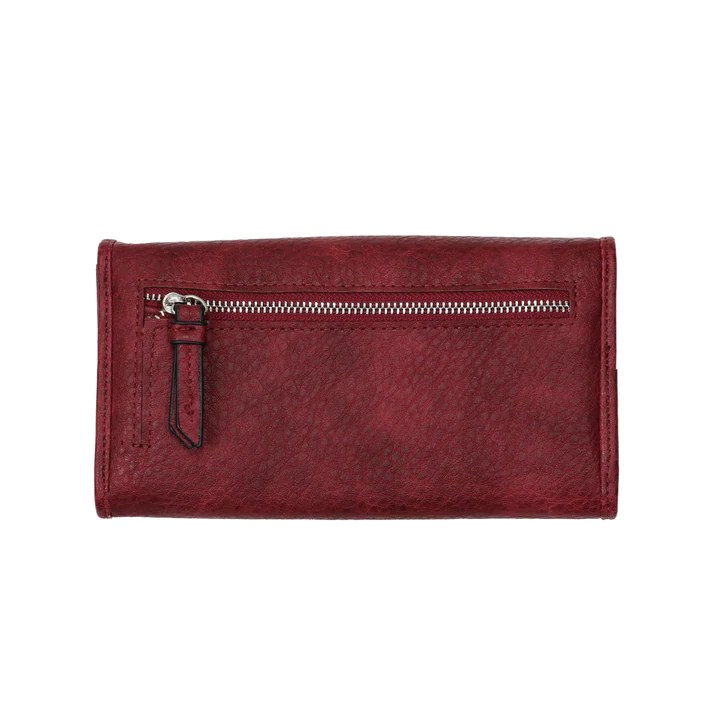 Keep your cards and cash neatly organized and secure with this RFID blocking, stylish tri-fold wallet by Lady Conceal. The RFID protections guards your ID and credit cards from unauthorized scans by creating a unique protective layer inside the wallet lining. The interior features 8 credit card slots, 2 clear ID holders, 3 bill compartments and a zippered pocket. An additional zippered coin pocket is located on the back. This wallet be used as a clutch by itself or as a wallet for a purse. Clutch handle clips on and off.